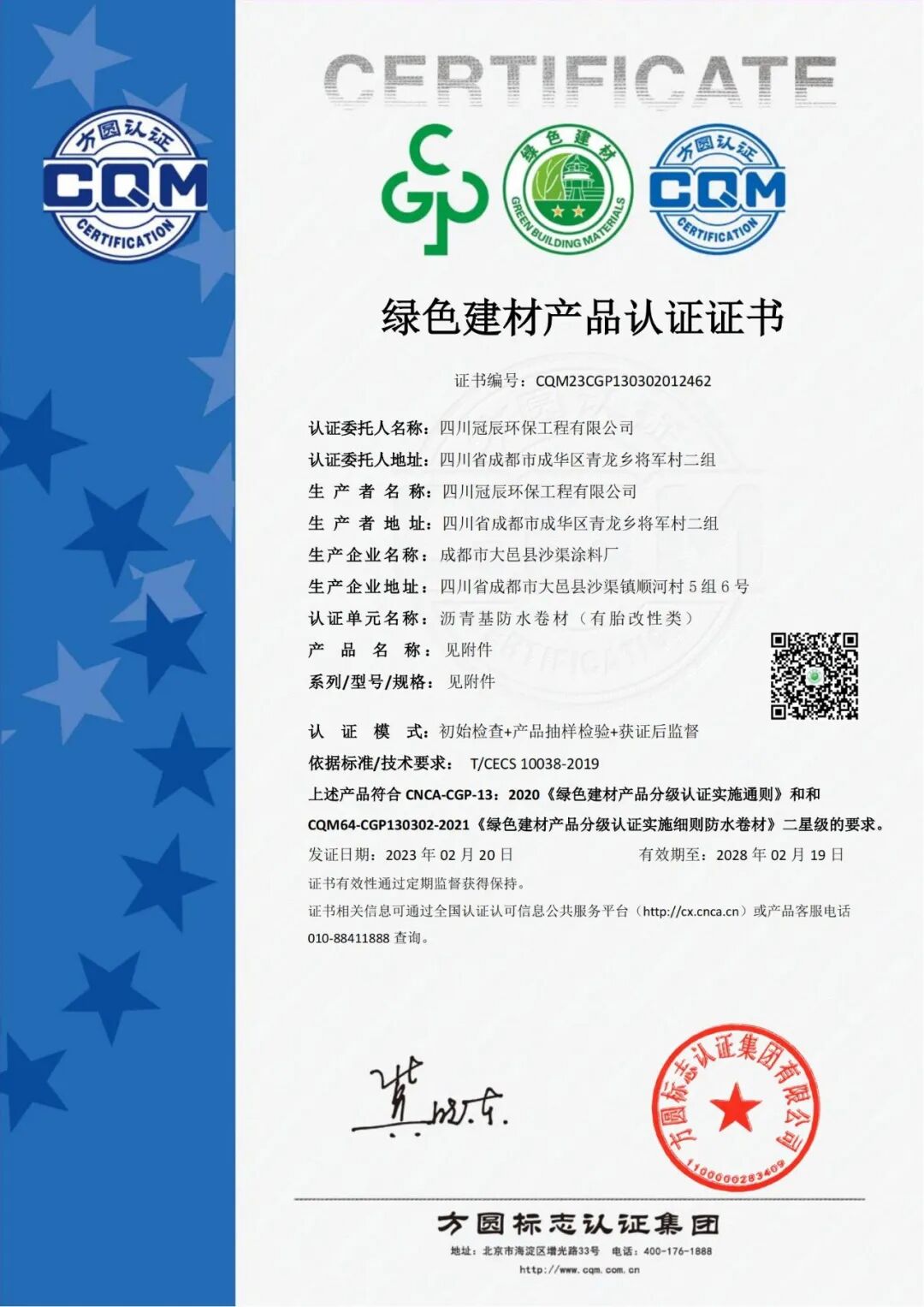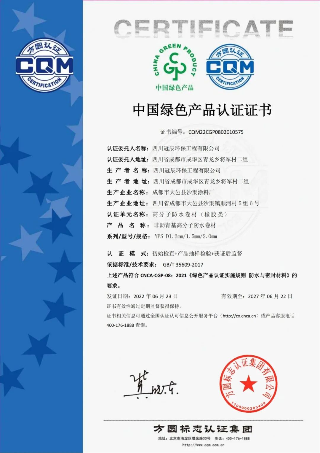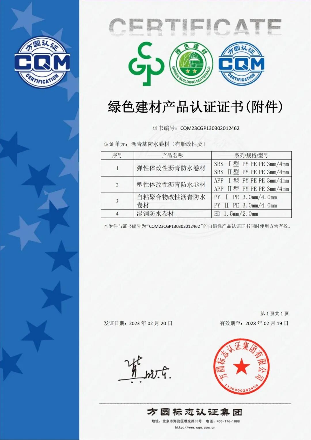 我司的聚乙烯丙纶复合防水卷材、非沥青基高分子防水卷材均获得了中国绿色产品认证证书。另外还有多种沥青基防水卷材获得绿色建材产品认证证书。